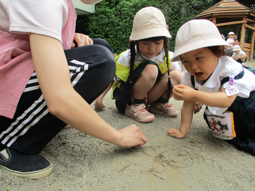 お天気のいい日は園庭でピクニックを楽しむ子ども。